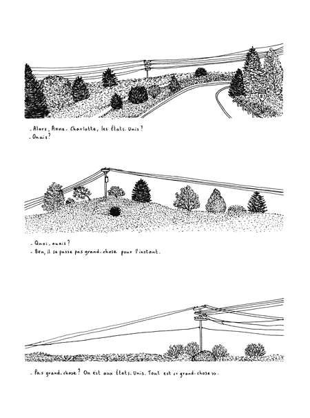 Narrativement, au-delà d’un journal intime, ces empilements de courts récits d’où émerge une certaine douceur forment une cartographie riche d’enseignements des modes de vie contemporains de nos contrées occidentales. De la Belgique au Canada, on y suit les jeunes adultes nomades d’aujourd’hui, pas toujours matures, confrontés aux problématiques du monde actuel. C’est en creux qu’il faut souvent comprendre les personnages qui peuplent ses récits et dont elle retranscrit avec une grande précision les attitudes et les propos.