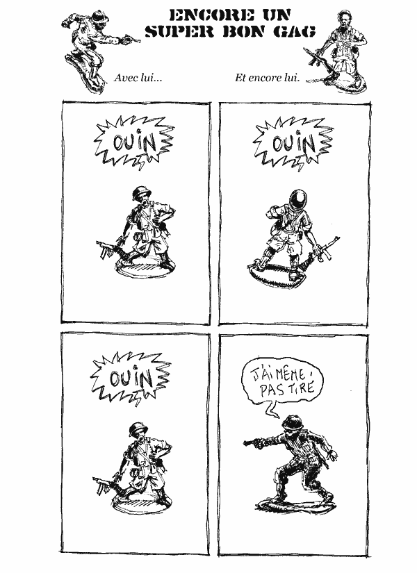 Soldats en plastique raconte toute l’histoire de l’humanité, à savoir l’envie irrépressible de l’homme à se foutre sur la gueule, quoi qu’il advienne. Les instruments de cette agression sont traditionnellement les soldats. Pour cette fois, on se contentera de leur version jouets (il n’est jamais trop tôt pour apprendre). Ces petits soldats, aux postures bien définis et à la fonction absurde et agressive se verront détournés de leurs fonctions premières le plus stupidement possible. Dans les années 60, le situationisme détourna roman-photos et bande dessinée, remplaçant les dialogues par des slogans et autres diatribes politiques, Fifi puise dans cette source-là avec cet ouvrage, en reproduisant méaniquement et sans volonté esthétique des imitations de scène de combat dans lesquelles il ajoute des dialogues totalement décalés et inadéquats. Il en ressort une impression d’absurdité teinté de cynisme, en phase avec notre confuse époque.