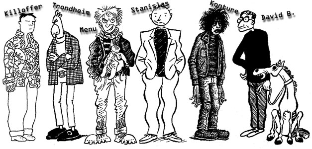 Menu : Lors dune des premières expos collectives des groupes davant-gardes, cétait celle de Trévise, en 91, Il ny avait encore ni Frigo, Ni Lapin, les espagnols (Raùl, Del Barrio) ou les Belges (Corbel, Lambé), on pouvait remarquer que, leur travaux était tous de suite visible en tant quexposition et fonctionnait bien, en couleurs et tout ça. Nous, nos planches, cétait tout petit, en noir et blanc, pleins de textes. Ca ne marchais pas du tout en tant quexposition. Cest clair quil y avait une dichotomie entre les gens qui pouvait être vu au mur et nous. Nous, cest vraiment fait pour être imprimé.