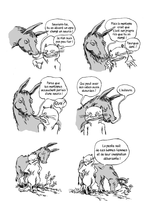 Le chat botté commence par présenter son histoire, de la création du marquis de Carabas à la lutte tactique contre l'ogre changé en rat. Il nous rappelle que les moralistes stoppent le récit au point qui les sert mais que l'histoire ne s'arrête pas au point final que Charles Perrault écrivit. Le maître chat apprend au début de notre histoire, alors qu'il goûte un repos bien mérité, qu'une montagne est en marche et qu'elle marche sur lui. La raison en est absurde : le chat a croqué un ogre changé en souris et la montagne a cru qu'il s'agissait de son propre fils. En effet ne dit-on pas que les montagnes accouchent parfois d'une souris ? Pour se tirer de ce mauvais pas, le maître chat décide de faire une alliance avec le peuple souriquois, afin de trouver une souris de rechange pour flouer la montagne. Les souris lui présentent leur meilleur élément, Patience, la souris qui a vaincu le lion de la fable ! Dans le même temps, craignant un coup fourré du maître chat, elles envoient un messager porter une lettre à l'auteure, pour s'assurer de la véracité de toute cette histoire. Le messager doit gagner les dernières pages du livre, susceptibles de porter l'adresse de l'auteure... Nous voilà ainsi parti pour une incursion pleine d’humour et de poésie dans le monde -revisité pour l’occasion- des fables de La Fontaine sous la fine plume de Nancy Peña. |